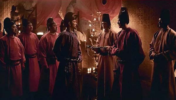 李善德要跑通各個(gè)衙門(mén)要錢(qián)要人要馬匹時(shí),就像一個(gè)大廠員工為了完成項(xiàng)目,跑財(cái)務(wù)、人力、技術(shù)、市場(chǎng)等部門(mén),各個(gè)部門(mén)把鍋甩得滿(mǎn)天飛,他只能仰頭長(zhǎng)嘆,不知道從何理起這團(tuán)亂麻。電影里也將大唐朝堂幾乎拍成了一個(gè)大廠員工跑寫(xiě)字樓的構(gòu)圖和視覺(jué)效果,上上下下,見(jiàn)了各種嘴臉,李善德站在一個(gè)圓圈的中間愁眉苦臉。閉環(huán)的意思,原來(lái)是讓人無(wú)路可走。