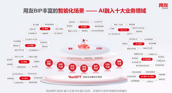 用友企業(yè)服務(wù)大模型YonGPT作為業(yè)界首個企業(yè)服務(wù)大模型,它融合了企業(yè)各個領(lǐng)域?qū)I(yè)知識和各類行業(yè)商業(yè)KnowHow,經(jīng)過領(lǐng)域、行業(yè)數(shù)據(jù)的預(yù)訓練和精調(diào)的企業(yè)應(yīng)用服務(wù)的大模型,結(jié)合了用友在企業(yè)服務(wù)領(lǐng)域的經(jīng)驗積累、領(lǐng)先并場景豐富的企業(yè)應(yīng)用軟件產(chǎn)品、大規(guī)模企業(yè)客戶基礎(chǔ)的優(yōu)勢,能夠理解、解析各類企業(yè)數(shù)據(jù),應(yīng)用于各類業(yè)務(wù)場景。其面向復雜的行業(yè)應(yīng)用場景, 通過對行業(yè)模型精調(diào)幫助企業(yè)實現(xiàn)智能化的業(yè)務(wù)運營、自然化的人機交互、智慧化的知識生成、語義化的應(yīng)用生成四大能力,為企業(yè)提供智能化的人機協(xié)作、業(yè)務(wù)洞察、商業(yè)決策支持和智能運營服務(wù),是深懂業(yè)務(wù)的大模型,已完全融入到企業(yè)的“研供產(chǎn)銷服、人財物客項”業(yè)務(wù)與管理場景中。