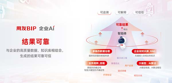 在結(jié)果可靠層面,用友BIP將大模 型的 “泛化能力”、小模型的 “場景智能”、高質(zhì)量數(shù)據(jù)的 “決策智能”、知識庫的 “專業(yè)知識” 深度融合,共同實現(xiàn)企業(yè)AI結(jié)果可靠。