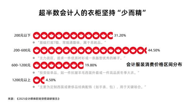 精打細(xì)算的職業(yè)本能,深刻影響了他們的消費(fèi)觀。企業(yè)會(huì)計(jì)的衣櫥堪稱“高效資產(chǎn)配置”。58.7%的人奉行“少而精”原則,愿意為核心單品支付更高單價(jià),追求更優(yōu)的材質(zhì)和更長的穿著周期。