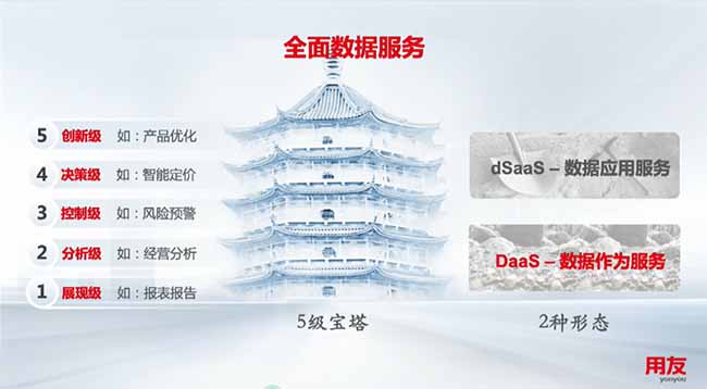 綜上,數(shù)據(jù)服務(wù)的“五級寶塔”,構(gòu)成了企業(yè)數(shù)據(jù)服務(wù)的完整體系!這與數(shù)據(jù)分析領(lǐng)域的四層分析層次也是不謀而合,都是對于企業(yè)數(shù)據(jù)服務(wù)深度的一種分類和表達。不同之處在于,用友提出數(shù)據(jù)服務(wù)“五級寶塔”模型,更側(cè)重于應(yīng)用場景層面,而數(shù)據(jù)分層的四個層次更側(cè)重于分析技術(shù)方面。