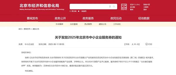 為進(jìn)一步降低中小企業(yè)創(chuàng)新發(fā)展成本,滿(mǎn)足日益增長(zhǎng)的服務(wù)需求,北京市經(jīng)濟(jì)和信息化局近日宣布補(bǔ)充2025年度北京市中小企業(yè)服務(wù)券供給額度,服務(wù)券將持續(xù)發(fā)放至9月份。