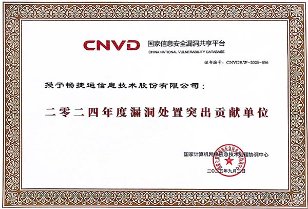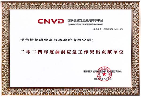 憑借成熟的安全管理體系和規(guī)范化的安全運營能力,用友暢捷通榮獲“CNVD漏洞處置突出貢獻單位” 與 “CNVD漏洞應(yīng)急工作突出貢獻單位” 兩項國家級榮譽。這不僅是對暢捷通在網(wǎng)絡(luò)安全領(lǐng)域?qū)I(yè)能力的權(quán)威認可,也體現(xiàn)了在保障客戶數(shù)據(jù)安全、筑牢數(shù)智防線方面的持續(xù)投入與扎實成果。