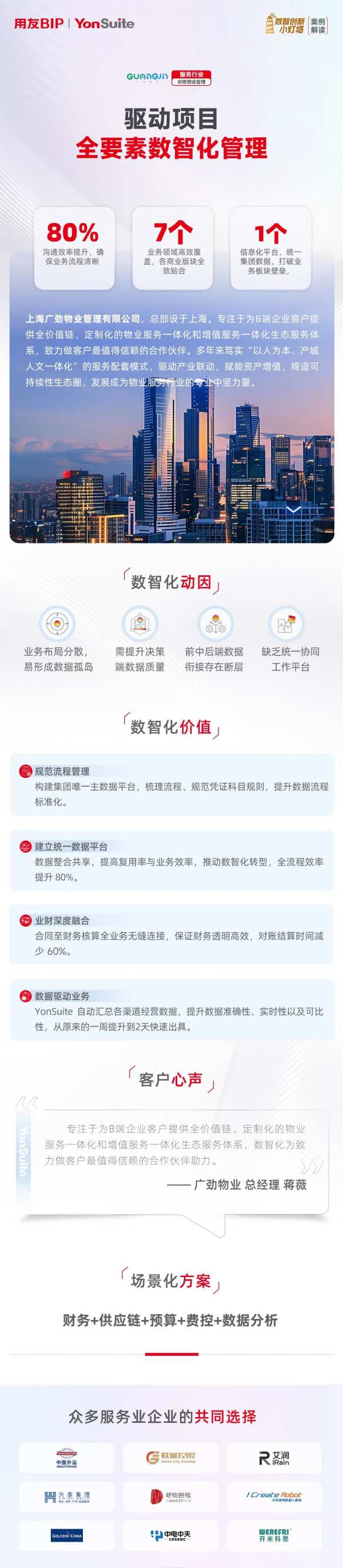 上海廣勁物業(yè)管理有限公司財務總蔣薇說:“我們一直專注給 B 端企業(yè)客戶,打造全流程、定制化的物業(yè)服務和增值服務生態(tài)。這次和用友 YonSuite 合作搞數(shù)智化,就是想成為客戶最靠譜的伙伴。” 從蔣薇這番話能看出來,廣勁物業(yè)下定決心,要用數(shù)智化升級物業(yè)服務。事實證明,這次轉型特別成功,不僅解決了數(shù)據(jù)不通、流程卡殼的老問題,還搭建起一套完整的項目數(shù)智化管理體系,給以后提升服務、拓展業(yè)務打下了堅實基礎。