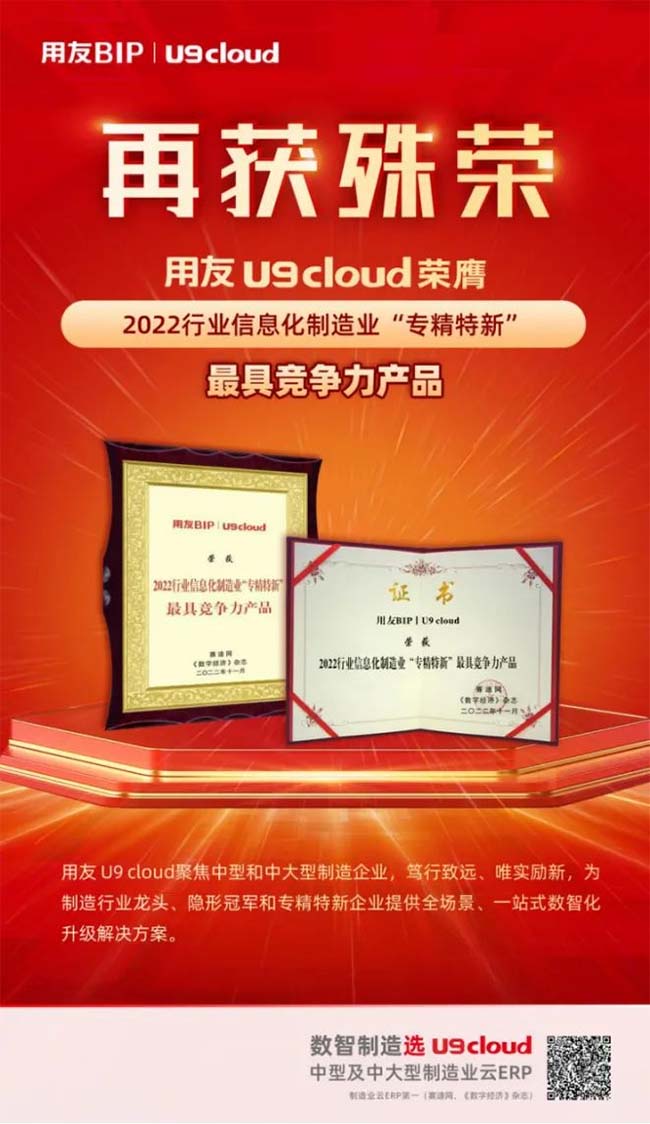 憑借在眾多制造企業(yè)的成功應(yīng)用,用友U9 cloud先后榮獲2022年中國制造業(yè)云ERP狀元獎(jiǎng)、2022行業(yè)信息化制造業(yè)“專精特新”最具競(jìng)爭(zhēng)力產(chǎn)品、2022新基建中型及中大型制造業(yè)云ERP首選品牌等一系列獎(jiǎng)項(xiàng),成為制造企業(yè)數(shù)智化轉(zhuǎn)型的首選品牌。