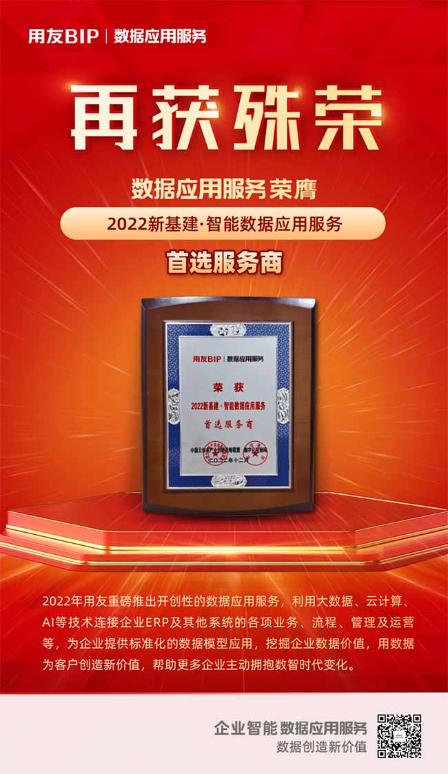 用友數(shù)據(jù)應(yīng)用服務(wù)憑借著先進(jìn)的技術(shù)架構(gòu)、創(chuàng)新的應(yīng)用模式和優(yōu)秀的客戶實(shí)踐,榮獲“2022新基建·智能數(shù)據(jù)應(yīng)用服務(wù)首選服務(wù)商”獎(jiǎng)項(xiàng)。